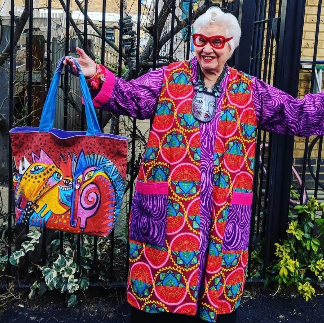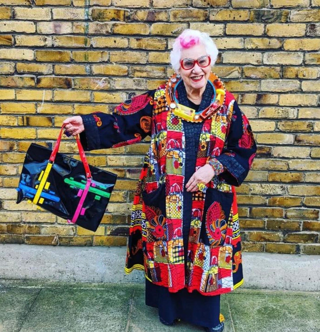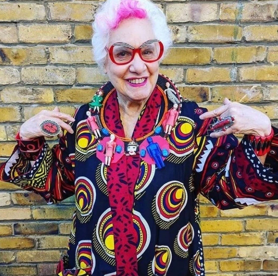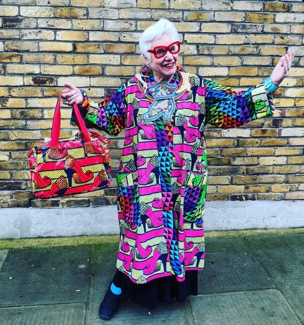 Born in NYC in 1940 and now a cornerstone of the UK art scene, Sue is a “color maniac” in the most glorious sense. She doesn’t follow fashion trends; she follows the pulse of art. For Sue, getting dressed is an act of curation. She carries her mentors, her heroes, and her own creations on her back, flaunting them as a gift to every stranger she passes on the street.