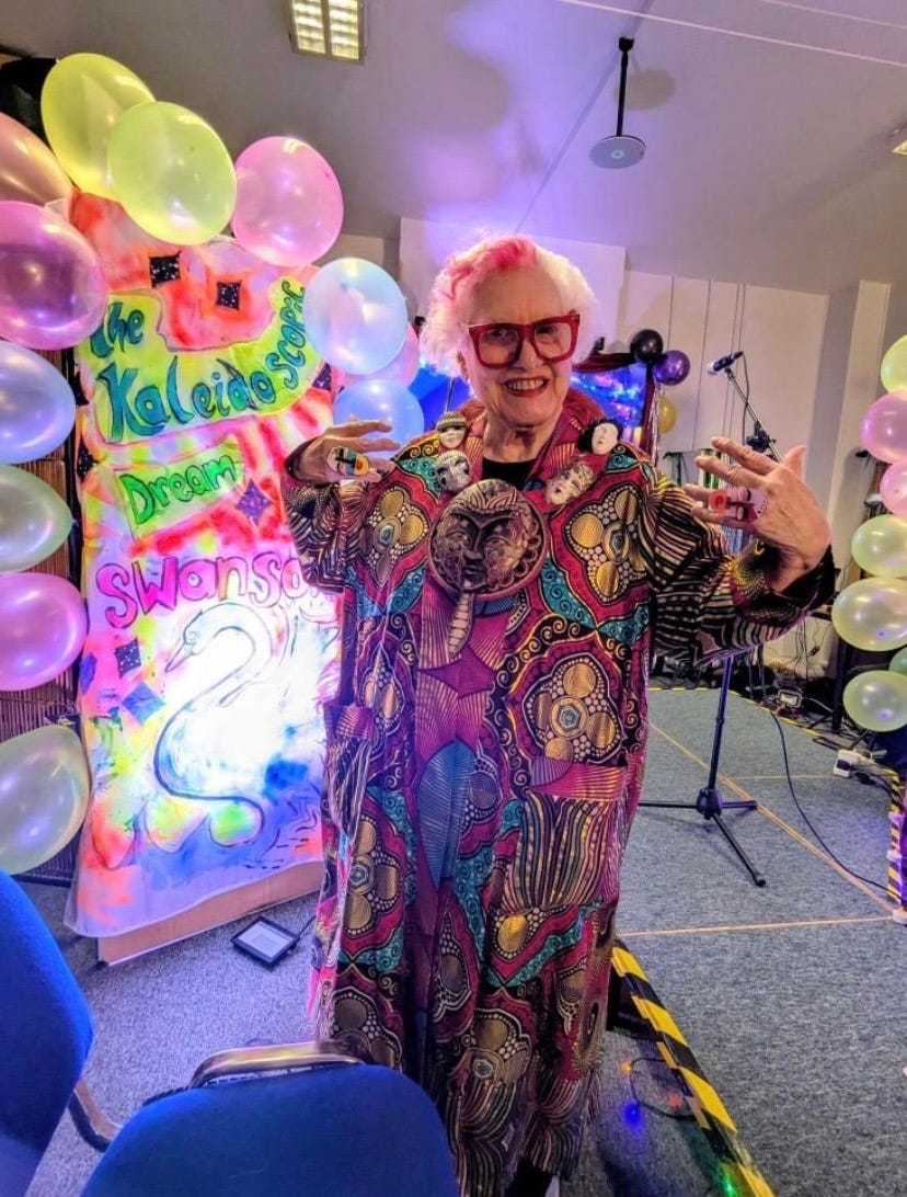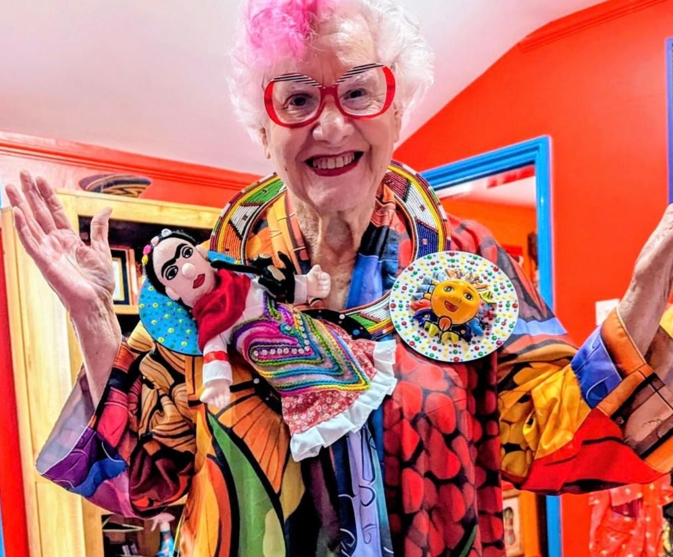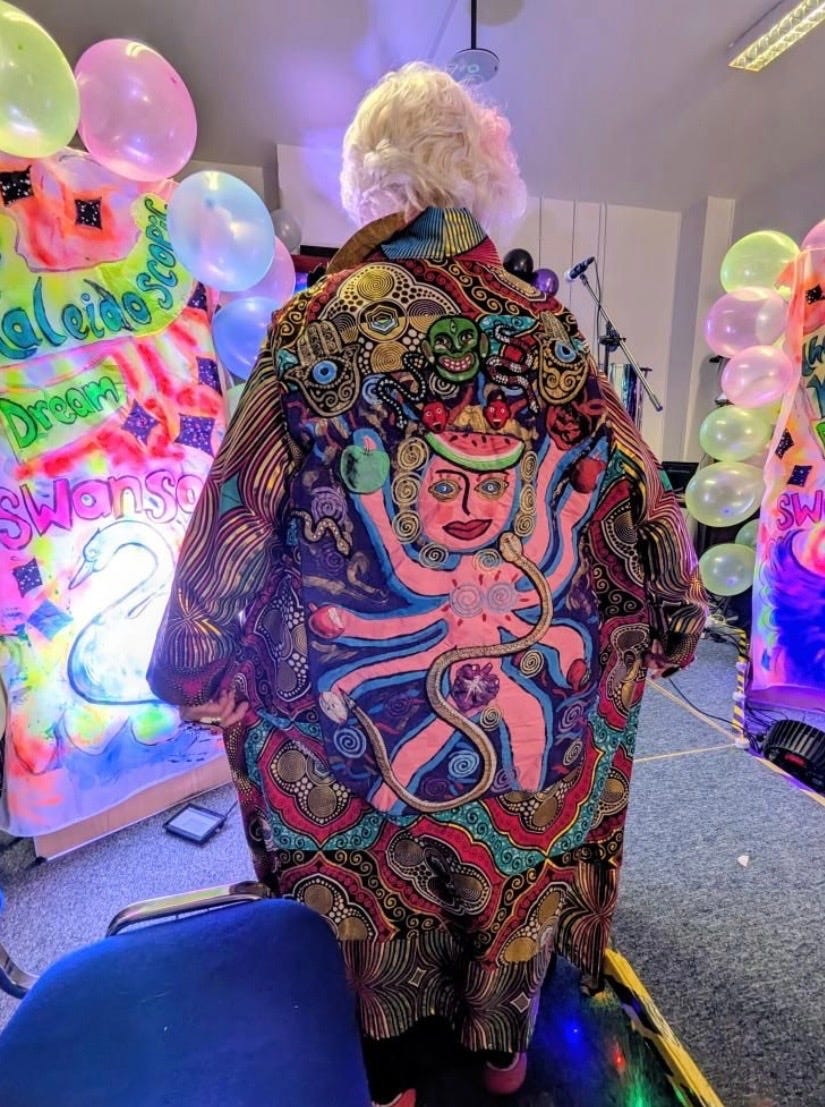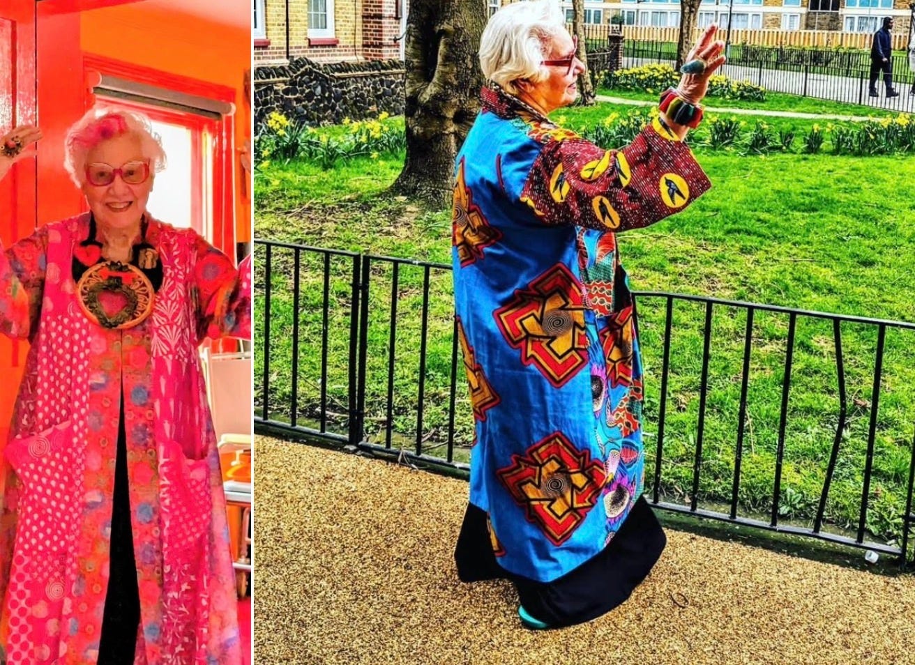 Sue’s style is a reminder that fashion can be a tool for mental health, a source of joy for the public, and a brave declaration of who we are. Let’s enter the “colourlicious” world of a true outsider artist.